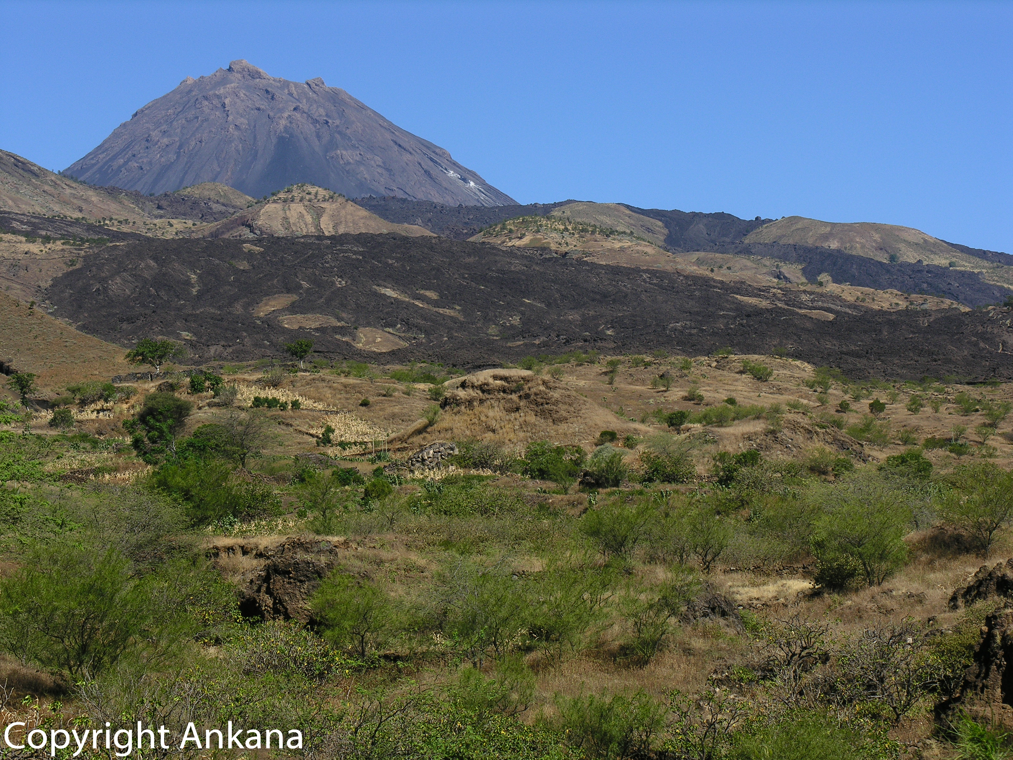 Von weitem sichtbar: der 2.829 m hohe Pico de Fogo, der aus einer großen Caldeira (1.600m) herausragt.